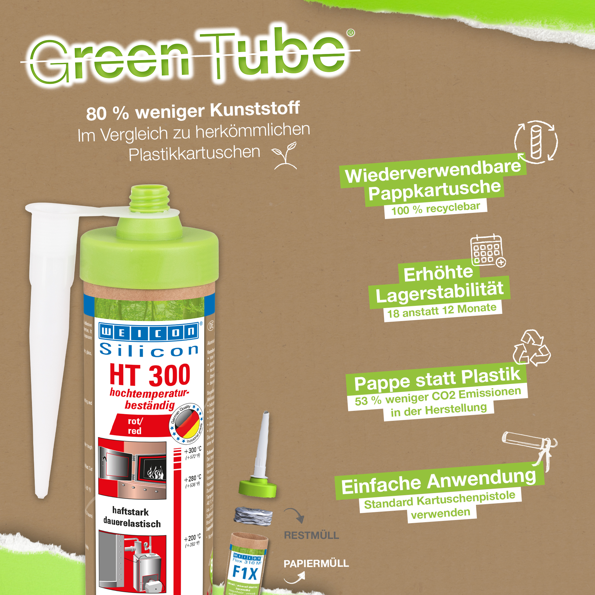 WEICON HT 300 ist rot, hochtemperaturbeständig (+300 °C/+572 °F), lösemittelfrei, haftstark, acetatvernetzend, witterungs-, alterungs- und chemikalienbeständig und extrem elastisch (Bruchdehnung von ca. 300%). Das Produkt ist besonders geeignet für hitzebelastete Verklebungen und Abdichtungen und haftet sehr gut auf Stahl, Aluminium, Glas, Keramik und vielen weiteren Werkstoffen. Der Kleb- und Dichtstoff kann in Industrieöfen, Rauchgasanlagen, Heizungsanlagen, Abgasführungen, Wärmeschränken und in vielen weiteren Bereichen eingesetzt werden.