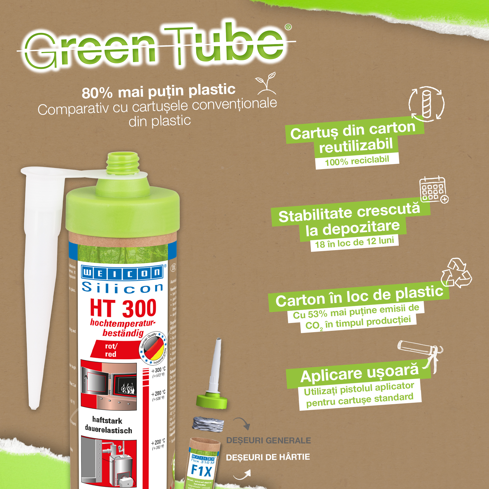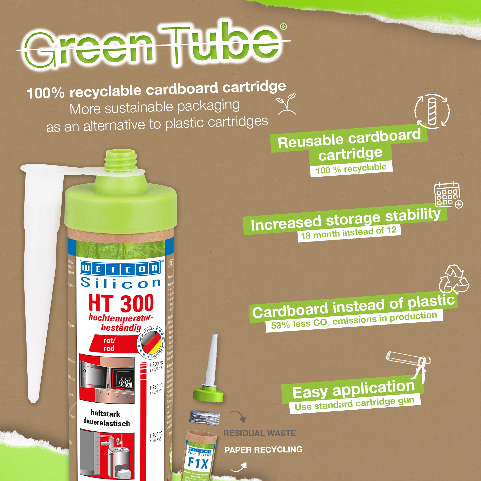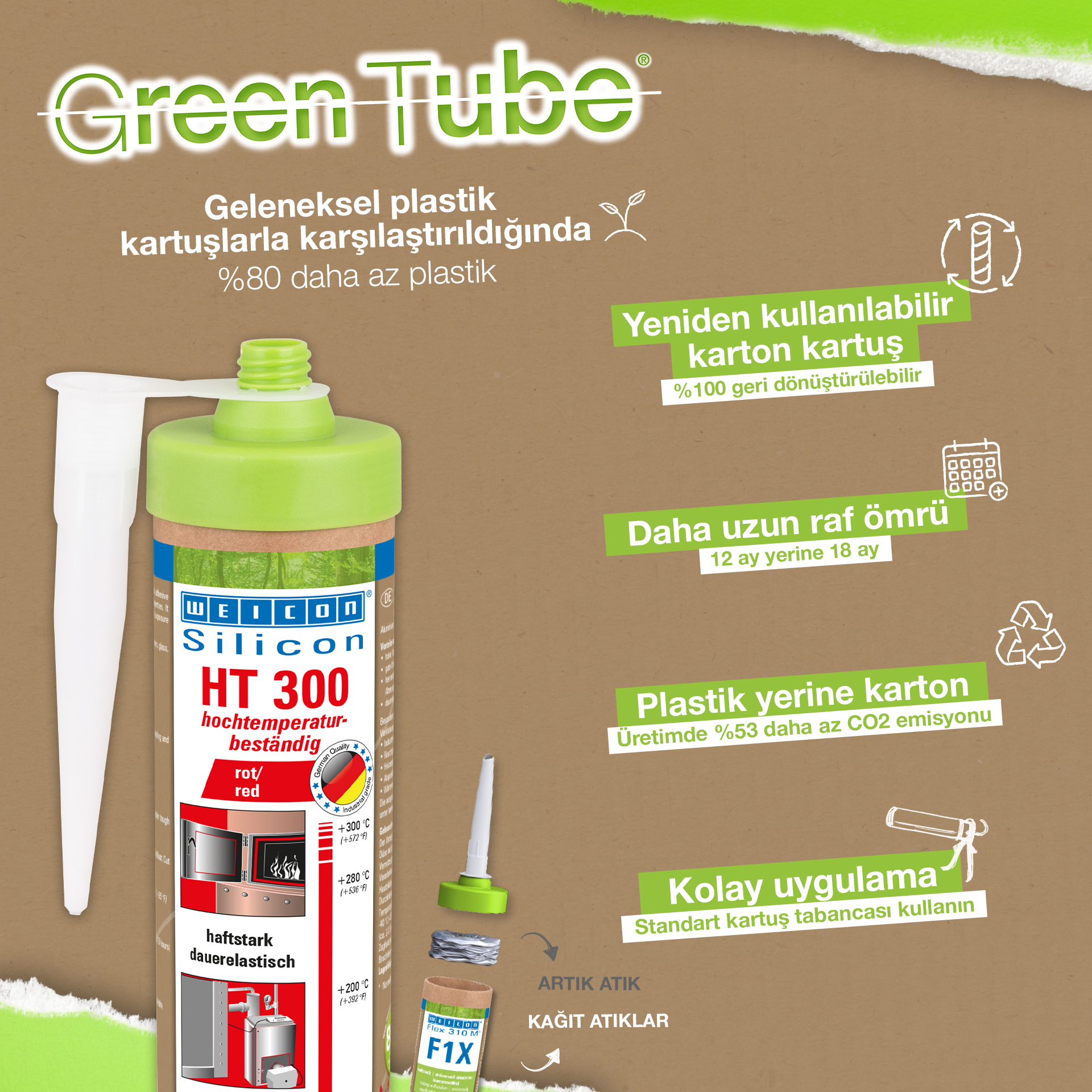 WEICON HT 300 ist rot, hochtemperaturbeständig (+300 °C/+572 °F), lösemittelfrei, haftstark, acetatvernetzend, witterungs-, alterungs- und chemikalienbeständig und extrem elastisch (Bruchdehnung von ca. 300%). Das Produkt ist besonders geeignet für hitzebelastete Verklebungen und Abdichtungen und haftet sehr gut auf Stahl, Aluminium, Glas, Keramik und vielen weiteren Werkstoffen. Der Kleb- und Dichtstoff kann in Industrieöfen, Rauchgasanlagen, Heizungsanlagen, Abgasführungen, Wärmeschränken und in vielen weiteren Bereichen eingesetzt werden.
