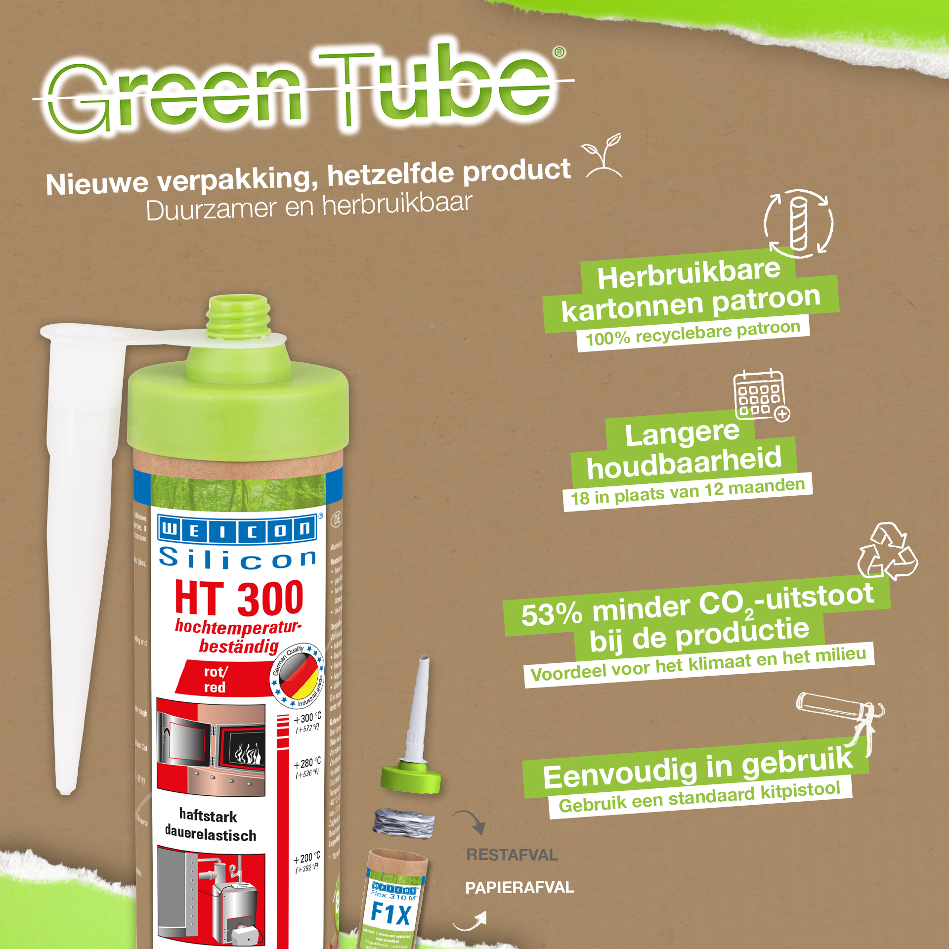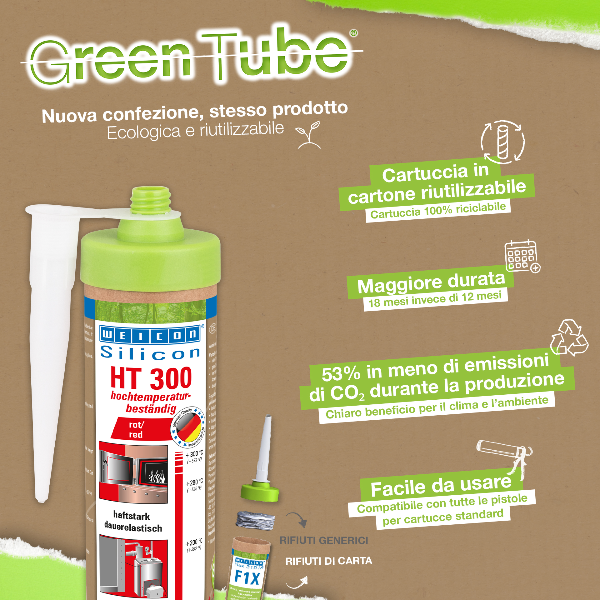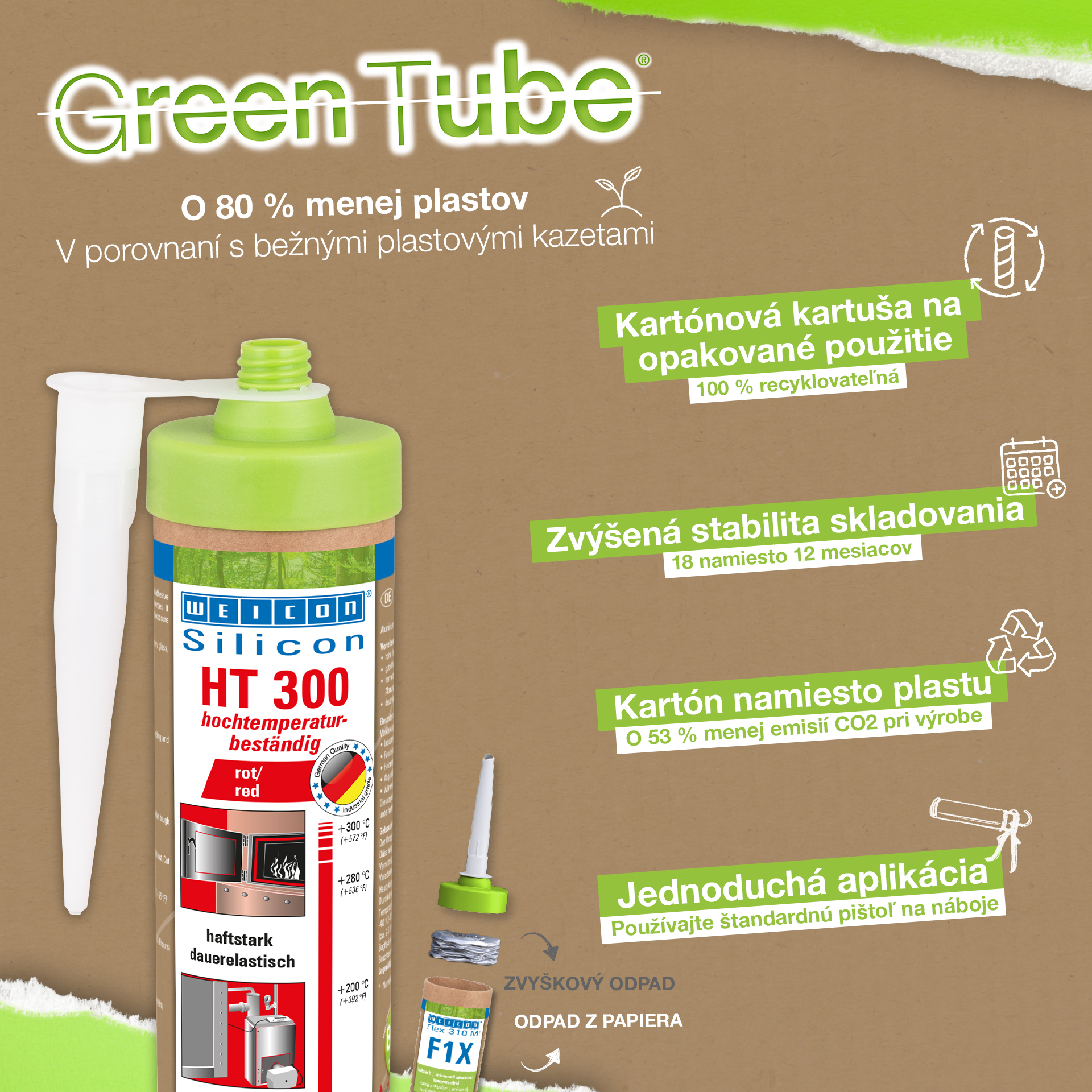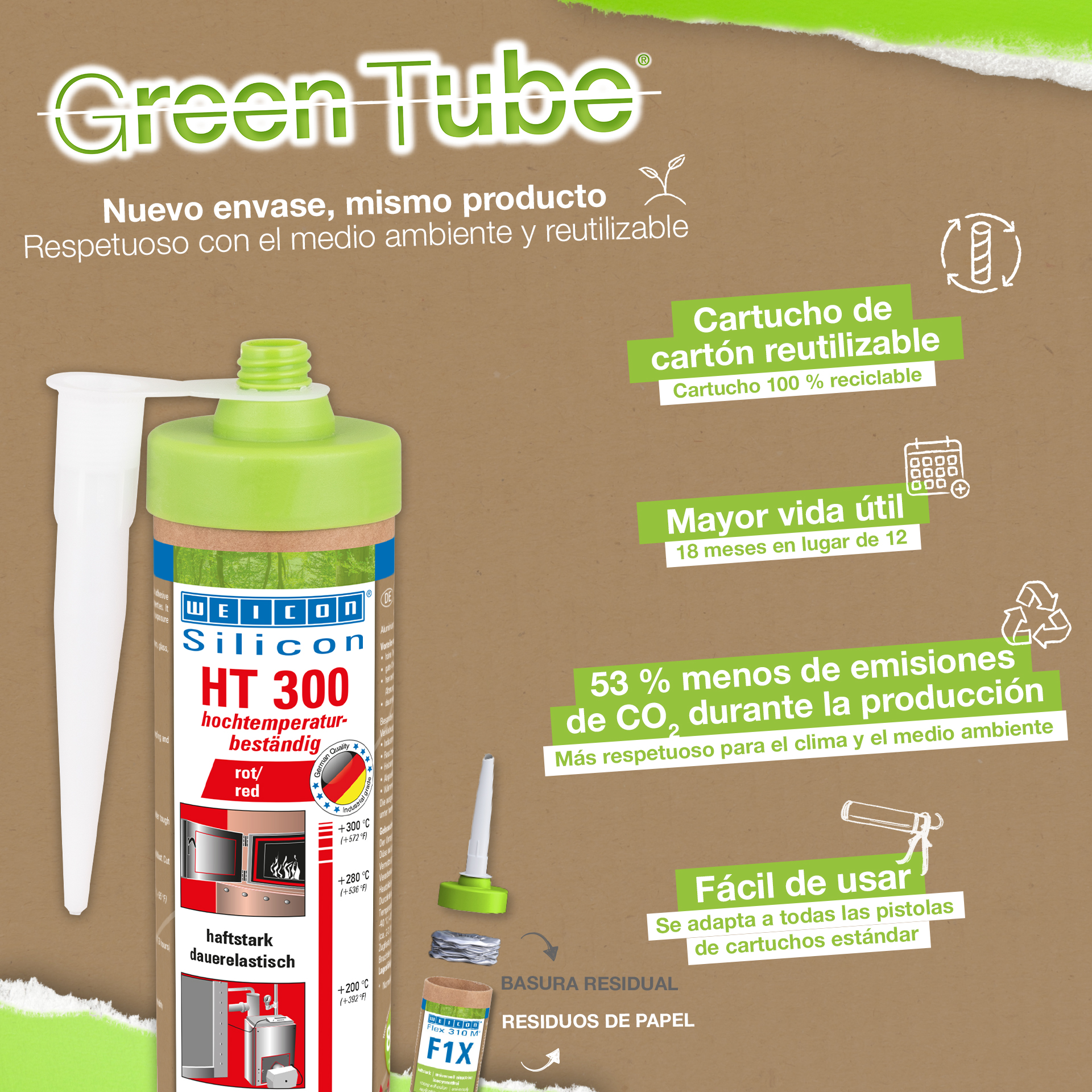 WEICON HT 300 ist rot, hochtemperaturbeständig (+300 °C/+572 °F), lösemittelfrei, haftstark, acetatvernetzend, witterungs-, alterungs- und chemikalienbeständig und extrem elastisch (Bruchdehnung von ca. 300%). Das Produkt ist besonders geeignet für hitzebelastete Verklebungen und Abdichtungen und haftet sehr gut auf Stahl, Aluminium, Glas, Keramik und vielen weiteren Werkstoffen. Der Kleb- und Dichtstoff kann in Industrieöfen, Rauchgasanlagen, Heizungsanlagen, Abgasführungen, Wärmeschränken und in vielen weiteren Bereichen eingesetzt werden.