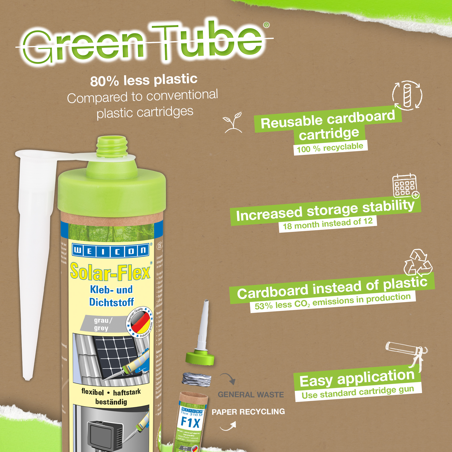 WEICON Solar-Flex ist haftstark, nicht korrosiv, „nass in nass“ überlackierbar, witterungsbeständig, UV-beständig und silikon-, isocyanat-, halogen- und lösemittelfrei. Solar-Flex ist ein elastischer Klebstoff auf MS-Polymer-Basis speziell für die Solarindustrie. Die sehr hohe Anfangshaftung und der schnelle Klebkraftaufbau ermöglichen Verklebungen auch an senkrechten Flächen. Ersetzt herkömmliche Befestigungsmethoden bei der Montage von Solar- und Photovoltaikanlagen.