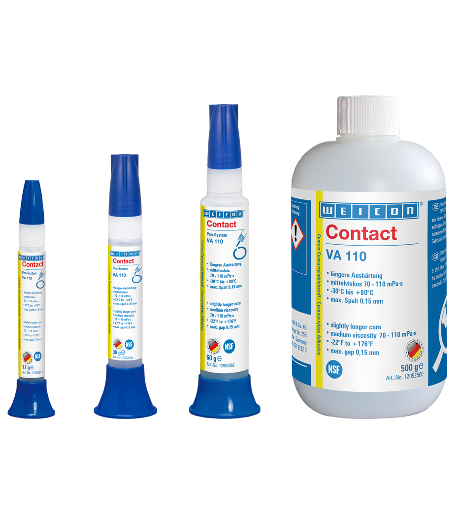 Bei Weicon VA 110 handelt es sich um einen Cyanacrylatklebstoff mit NSF-Zulassung, der in sensiblen Bereichen, wie im Lebensmittel- und Trinkwasserbereich, in der Pharmaindustrie oder bei der Spielzeugherstellung für Gummi- und Kunststoffverklebungen verwendet werden kann.