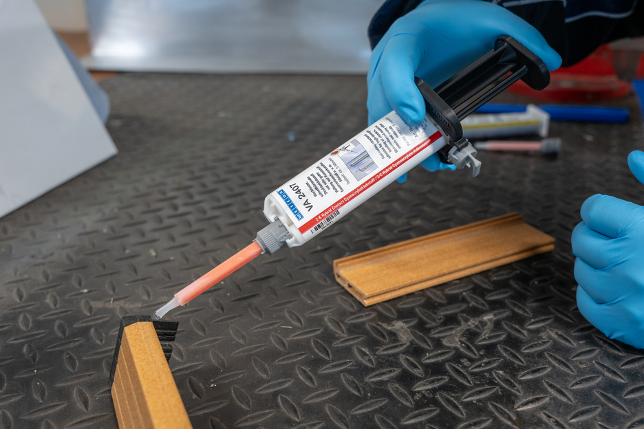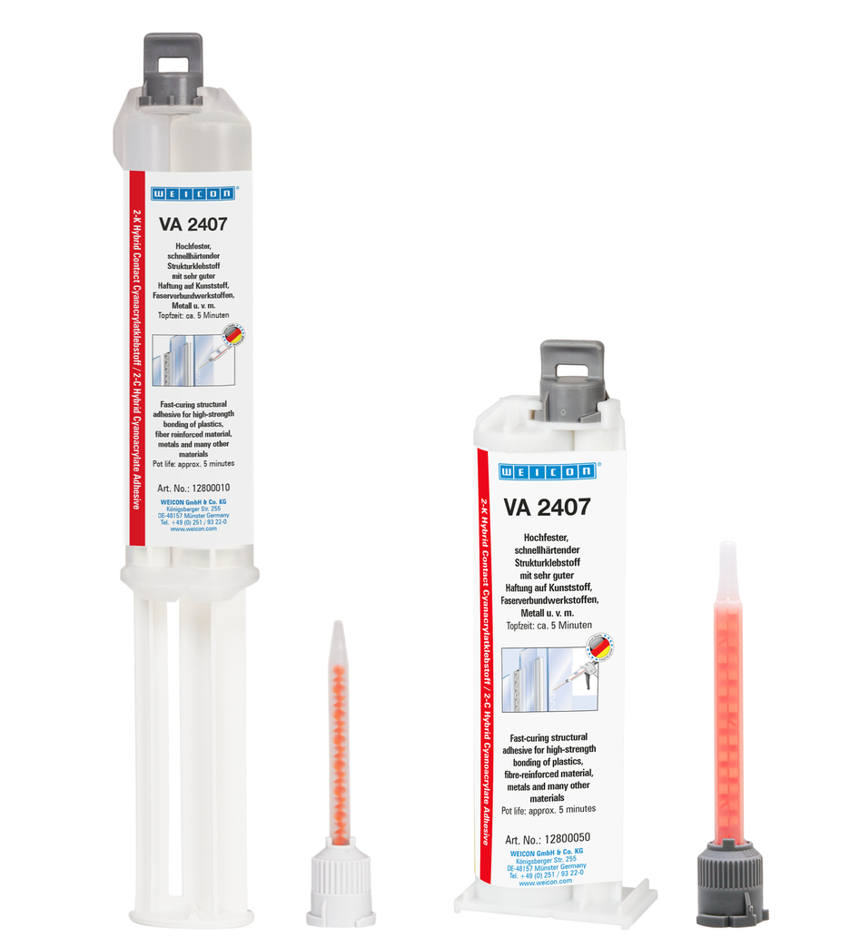 Der VA 2407 ist ein farbloser und glasklar aushärtender Zweikomponenten-Cyanacrylatklebstoff für die Verklebung der unterschiedlichsten Materialien mit und untereinander. Er haftet sehr gut auf vielen Kunststoffen (z. B. Polycarbonat), Stahl, Edelstahl, Aluminium, Keramik, Glas sowie Gummi. Der neu entwickelte Klebstoff vereint die Vorteile von Sofortklebstoffen mit der Prozesssicherheit von 2-Komponenten Klebstoffen. Der hochfeste und schnellhärtende Strukturklebstoff ist nach ca. 25 Minuten schleif- und überlackierbar. Er ist beständig gegenüber Witterung, vielen aggressiven Chemikalien, Schlagbeanspruchung und Vibrationen. Er ist von -20 °C bis +120 °C (-4° bis +248 °F) temperaturbeständig. Je nach Geometrie der Klebung können mit VA 2407 Spalte von bis zu 5 mm überbrückt werden. Durch seine schnelle und schlagzähe Aushärtung ist er besonders für Verklebungen von z. B. Kunststoff und Gummi geeignet. Auch bei strukturellen Verklebungen, bei denen eine farbige Klebefuge den optischen Gesamteindruck des Bauteils stören würde, kann er zum Einsatz kommen. Mit VA 2407 können transparente Kunststoffe, wie z. B. Plexiglas und andere Materialien, sauber und optisch ansprechend hochfest mit- und untereinander verbunden werden. Der Klebstoff eignet sich für die verschiedensten Anwendungen in der Kunststofftechnik, im Maschinenbau, im Modell- und Formenbau, im Metallbau, im Schiffs- und Bootsbau, im Karosserie- und Fahrzeugbau, im Messe- und Ausstellungsbau sowie in vielen weiteren Bereichen der Industrie.