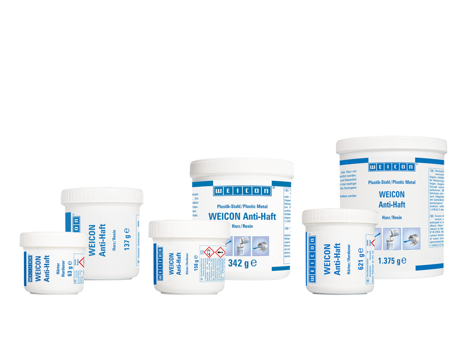 WEICON Anti-Haft ist ein flüssiges, graues 2-K Epoxidharz-System mit mineralischen Füllstoffen zum Schutz von stark beanspruchten Oberflächen gegenüber aggressiven Chemikalien und Korrosion. Es wurde speziell für die Verarbeitung mit einer Niederdruckanlage entwickelt. Zusätzlich zu den mineralischen Füllstoffen enthält Anti-Haft spezielle Additive, die einen Anti-Stick-Effekt bewirken und damit das Anhaften von beispielsweise Mehl, Staub oder Schwebeteilchen verhindern. Das Epoxidharz-System verfügt über eine gute chemische und thermische Beständigkeit bis zu +120 °C. Es ist frei von Lösemitteln und härtet nahezu schwundfrei aus. Durch eine Beschichtung mit WEICON Anti-Haft, das Oberflächen ein sehr glattes Finish verleiht, wird die Fließgeschwindigkeit von Flüssigkeiten gesteigert und so die Effizienz von Pumpen, Rohren, Ventilen usw. um 5 bis 20 % erhöht. Anti-Haft wird nach gründlicher Vorbereitung des Untergrundes durch Sandstrahlen direkt auf die Teile aufgetragen. Die Beschichtung haftet sehr gut auf den unterschiedlichsten Oberflächen und eignet sich für die verschiedensten Teile, wie Gleitlager, Rutschen, Trichter und Rohre sowie zur Beschichtung von Gussteilen und Ventilen. Das System kann im Maschinen- und Anlagenbau, im Apparatebau, in der Papierindustrie, in der Schüttgutindustrie, in Abgasanlagen, im Bergbau, im Tagebau, in Chemieanlagen und in vielen anderen Bereichen der industriellen Produktion eingesetzt werden. In jedem Fall werden Vorversuche unter praxisnahen Bedingungen empfohlen; insbesondere, wenn die Teile zusätzlich erhöhter Temperatur oder mechanischer Belastung ausgesetzt sind. WEICON Anti-Haft eignet sich allein oder in Kombination mit einem der anderen WEICON Plastik-Stahl Typen für einen Systemaufbau als Anti-Haftbeschichtung.