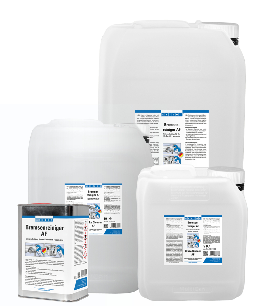 WEICON Bremsenreiniger AF ist ein acetonfreier Universalreiniger für den Automobilbereich. Der Flüssigwirkstoff reinigt, entfettet und verdunstet völlig rückstandsfrei. Bremsenreiniger AF entfettet und reinigt schnell und mühelos Metalle, Glas, Gummimaterialien, pulverbeschichtete Oberflächen, viele Kunststoffe und entfernt zuverlässig öl- und fetthaltige Verschmutzungen und Rückstände. Der Reiniger kann an Bremsen (Trommel- und Scheibenbremsen, Belägen, Bremsklötzen, Zylindern, Federn und Buchsen), an Kupplungen (Kupplungsbelägen und -teilen) oder an Motorteilen (Vergasern, Benzin- und Ölpumpen, Getrieben etc.) zum Einsatz kommen. Er eignet sich aber auch zur Reinigung von Kunststoffprofilen, Dichtungen oder lackierten Flächen und kann in vielen Bereichen der Industrie sowie im Handwerk verwendet werden.