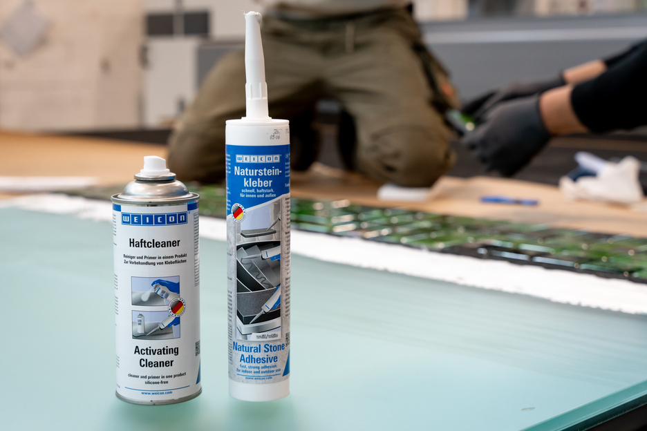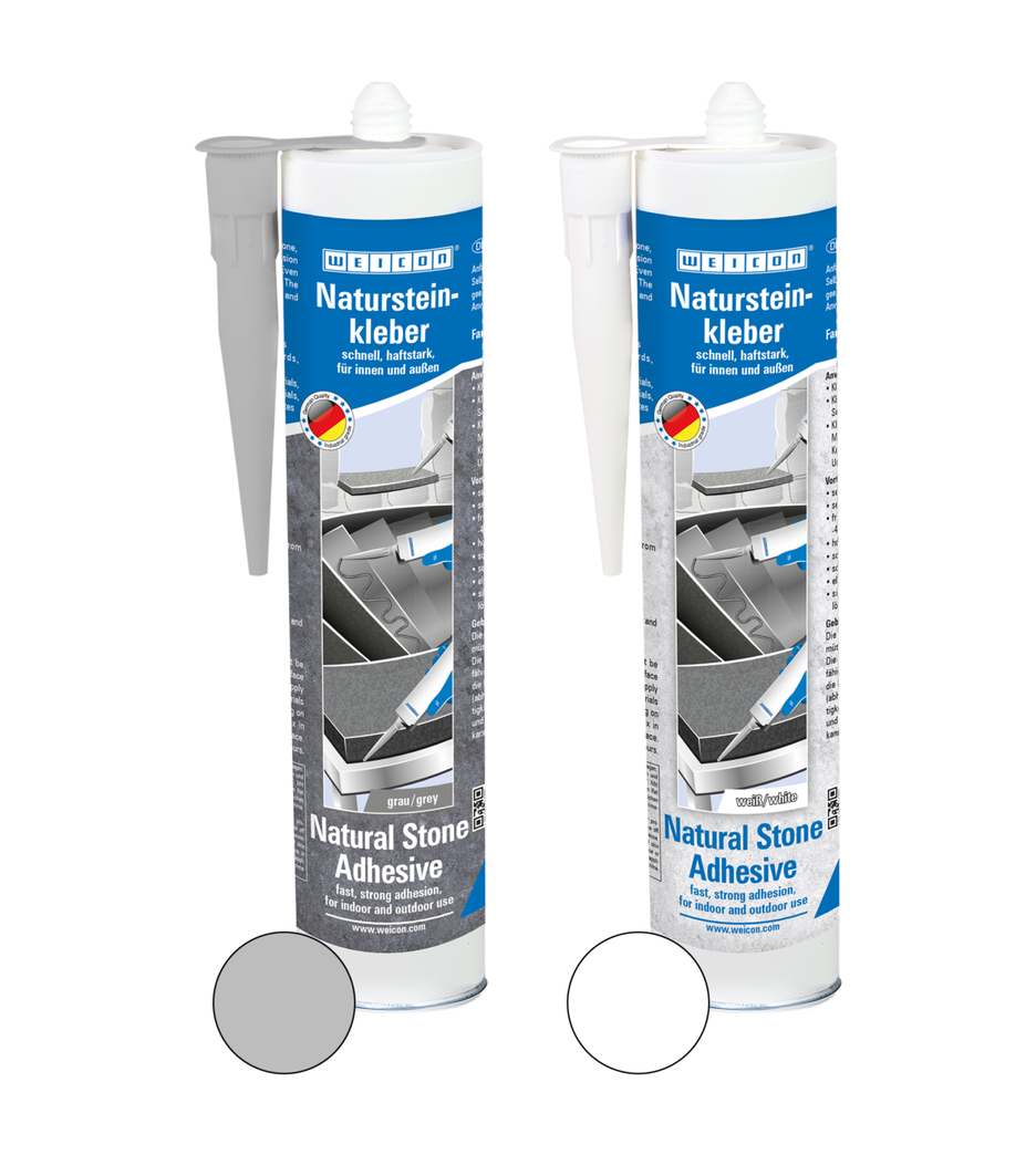 WEICON Natursteinkleber ist ein haftstarker Klebstoff für die Montage von Naturstein, Stein und Keramik. Durch seine sehr hohe Anfangshaftung und den schnellen Klebkraftaufbau sind Verklebungen selbst an senkrechten Flächen, wie Wänden, möglich. Der Steinkleber eignet sich für viele Anwendungen im Innen- und Außenbereich. Er ist frostsicher, hat eine hohe Temperaturbeständigkeit von -40 °C bis +90 °C sowie eine hohe Witterungs- und UV-Beständigkeit. Der Natursteinkleber härtet schnell aus und hat eine sehr hohe Endfestigkeit. Nach der Aushärtung ist der Klebstoff schleiffähig und bleibt elastisch, um so Bewegungen auszugleichen. Der Steinkleber ist silikonfrei, isocyanatfrei, halogenfrei und lösemittelfrei. Er kann in den verschiedensten Anwendungen eingesetzt werden – sei es beim Verkleben von Fensterbänken, Fliesen, Fußbodenleisten, Sockelleisten, Zierleisten oder Treppenstufen. WEICON Natursteinkleber haftet sehr gut auf den unterschiedlichsten Materialien, wie Holz, Holzwerkstoffen, Kunststoffen, Metallen, Glas und mineralischen Untergründen. Er ist in den Farben grau und weiß verfügbar.