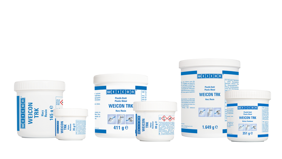 Das Epoxidharz-System WEICON TRK ist ein Verschleißschutz mit hochfesten Korundpartikeln zum Schutz von Metalloberflächen. Neben der hohen Abriebfestigkeit verfügt das System über eine gute chemische Beständigkeit und eine hervorragende Haftung auf Metallen und Keramik selbst unter Vibration oder Dehnung. Der Verschleißschutz ist selbstnivellierend und bildet eine sehr glatte und ebenmäßige Oberfläche. WEICON TRK wird auch zum Fixieren, Verbinden und Hinterfüllen im Maschinenbau eingesetzt – beispielsweise zur Verbindung von Aluminiumteilen mit Edelstahl. Typische Anwendungen des Verschleißschutzes sind Pumpen, Zyklone, Schütten, Förderanlagen, Leitungen für Pulver, Separatoren oder Trichter. Im Maschinenbau wird WEICON TRK zur Fixierung von Maschinenteilen und Führungsleisten bzw. zur Unterfütterung ganzer Maschinen eingesetzt. Die Nutzung des Systems als Vergussmasse zur Anpassung und Fixierung von Maschinenteilen kann lange Bearbeitungszeiten oft deutlich reduzieren.